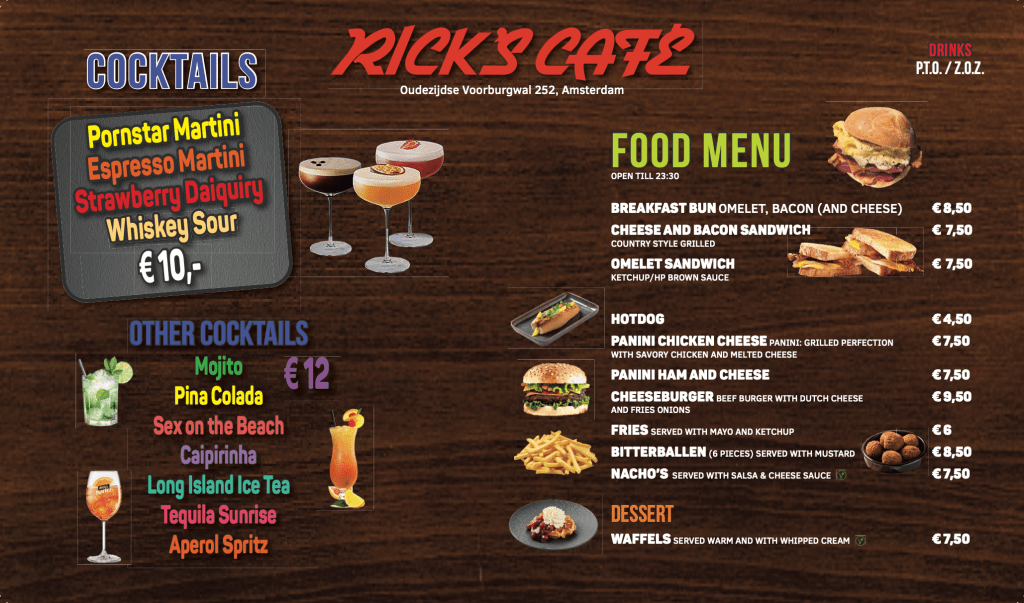 Welcome to Rick’s Café, your cozy corner in the heart of Amsterdam. Whether you’re looking to unwind with a cup of coffee, enjoy a delicious meal, or catch a live game with friends, our café offers a warm atmosphere and a touch of local charm. Stop by for a taste of Amsterdam’s vibrant culture, right in the center of the city.